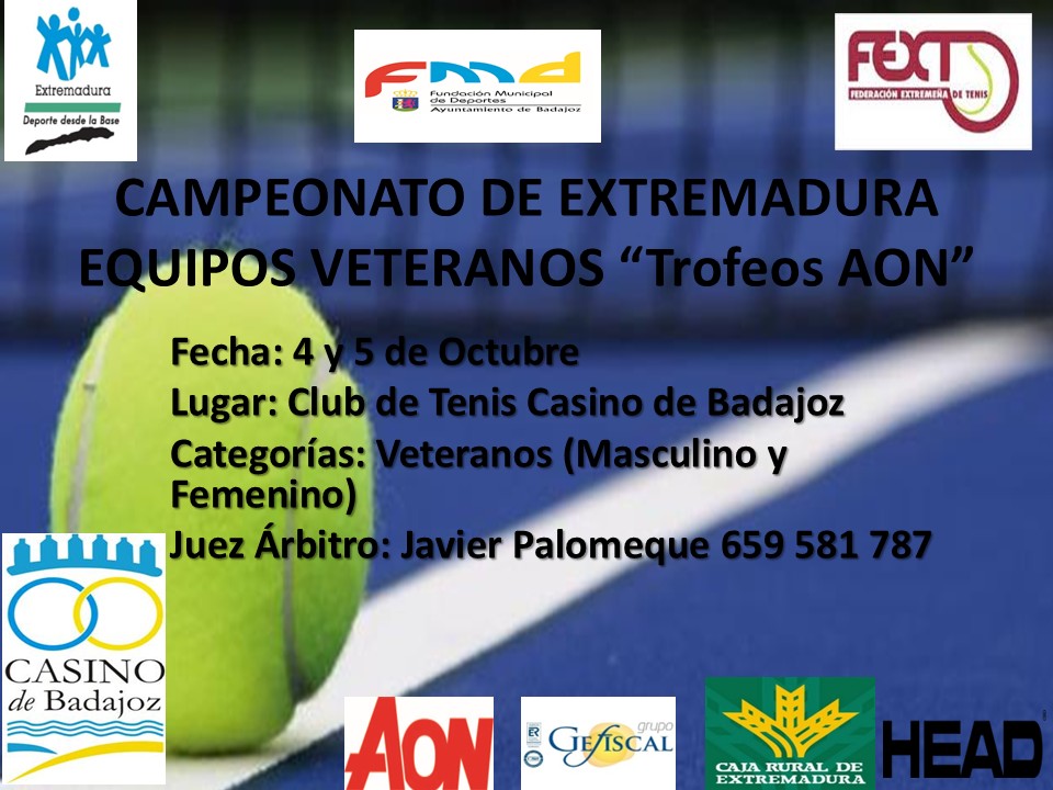 Los días 4 y 5 de Octubre se celebrará en el Casino de Badajoz el Campeonato de Extremadura de Veteranos por Equipos » Trofeo AON». El plazo de inscripción finalizará el martes 30 de septiembre a través de ISQUAD con el ordenador https://resultadostenis.isquad.es/5/campeonato/32802
